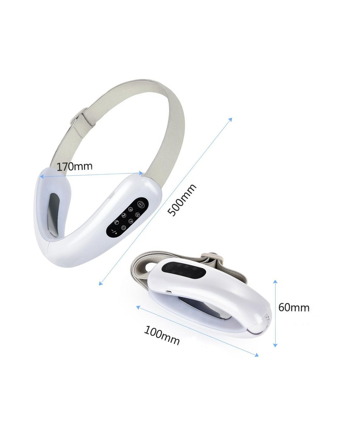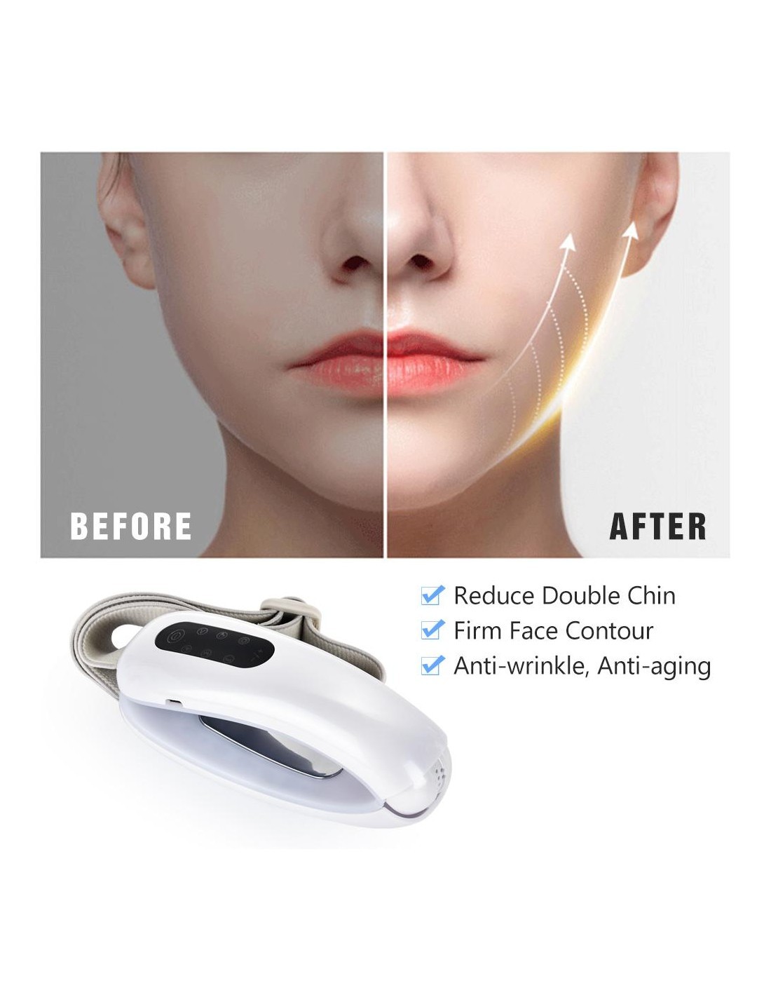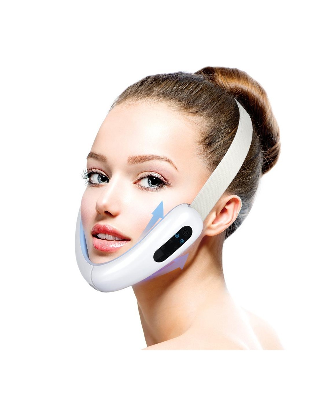 - Passen Sie das Gummiband entsprechend Ihrer Gesichtskontur an und positionieren Sie das Produkt so, dass das Kinn perfekt im V des Geräts eingefasst ist.