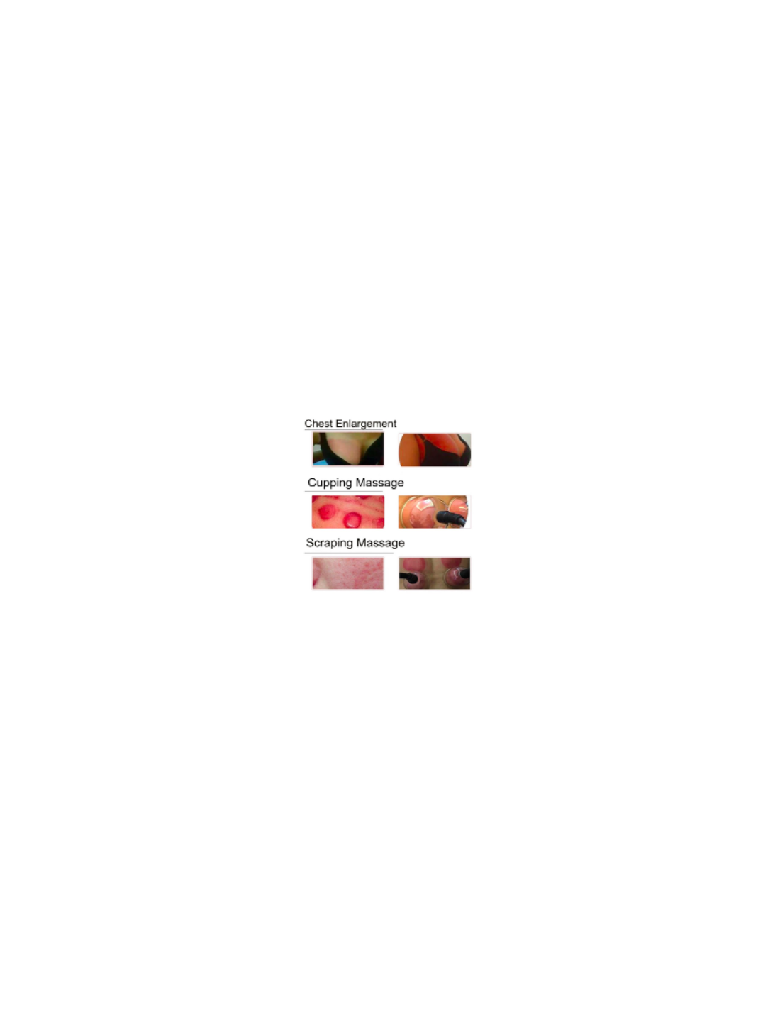 Durch das Einwirken des Vakuums auf den menschlichen Körper zieht das Spezialwerkzeug die Brüste so an, dass sie relativ hoch stehen, um den Effekt einer Brustvergrößerung zu erzielen. Das Vakuum in der Tasse kann zu einer Verstopfung der lokalen Kapillaren führen, kann die Organe stimulieren, die Vitalität der Zellen steigern, die funktionelle Aktivität fördern und die Widerstandskraft des Körpers verbessern. Die mechanische Vakuumstimulation kann über den Reflexweg an das zentrale Nervensystem übertragen werden, das die neurale Aktivität regulieren kann, um das Gleichgewicht aufrechtzuerhalten. Während der Operation kann das Vorhandensein und Fehlen von Vakuum dazu führen, dass sich die lokalen Poren kontinuierlich öffnen und schließen, die Hautatmung fördern, die Menge an absorbiertem Sauerstoff erhöhen und die Ausscheidung von Abfall beschleunigen. Es hat die Wirkung, die Meridiane zu erwärmen und die Kollateralen auszubaggern, Qi und Blut zirkulieren zu lassen, die Löcher zu öffnen und die Sehnen zu entspannen, Blutstauungen zu beseitigen und Schwellungen zu reduzieren, den Körper zu entgiften und Krankheitserreger zu reinigen.