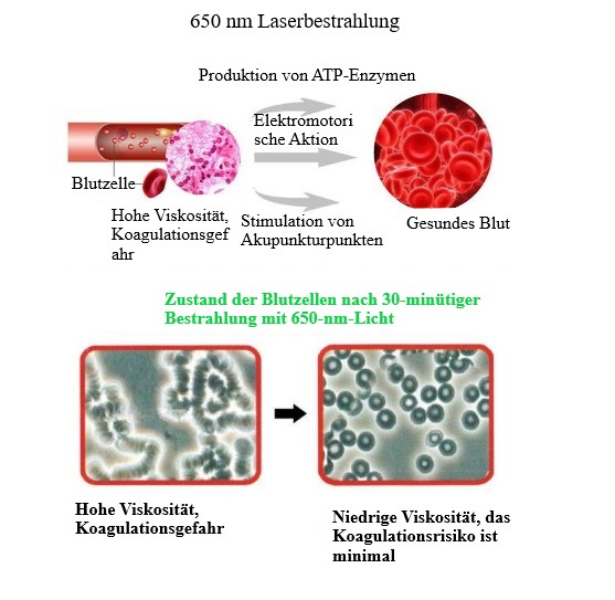 Grünes Licht (520 nm) wirkt auf Hämoglobin, die Eisenverbindung im Blut in roten Blutkörperchen. Verbessert die Zellfunktion, das Verhalten und die Elastizität sowie die Sauerstoffversorgung. Weitere Wirkungen: verbesserte Sauerstoffaffinität, verringerte Milchsäure, verringerte Blutviskosität, verbesserte Durchblutung.
