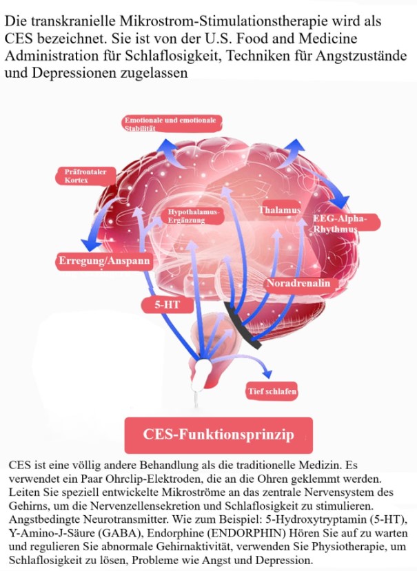 Dieses Gerät arbeitet mit der CES-Therapie (Cranial Electrotherapy Stimulation), d. h. der „kranialen Elektrotherapie-Stimulation“. Dabei wird Mikrostrom mit niedriger Intensität verwendet, um die Diffusion des limbischen Systems im Gehirn mit Frequenz zu stimulieren.